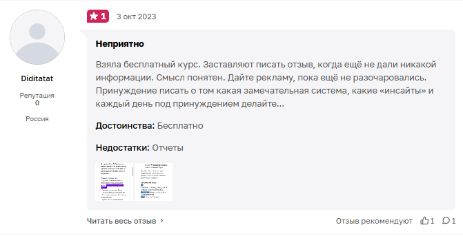В сети достаточно много положительных отзывов о работе проекта. Но их рассматривать мы не видим особого смысла. Это связано с тем, что написание положительного отзыва, а также привлечение рефералов является обязательным условием для продолжения обучения в клубе. Об этом можно прочитать в негативных отзывах: