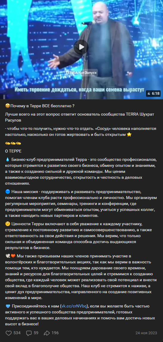 Последняя публикация в нем вышла 22 декабря 2022 года. Но с января того же года авторы стали переманивать аудиторию в другую группу – Терра Некоммерческий бизнес-клуб: