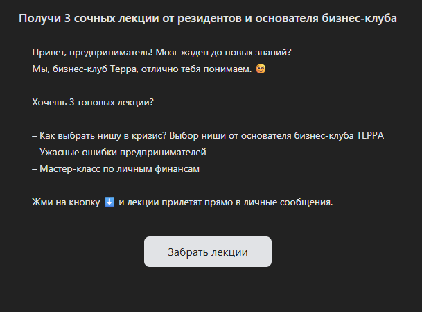 Этот так называемый бизнес-клуб «Терра» оказался очередной ловушкой для доверчивых людей. Обещания бесплатного обучения обернулись навязыванием платных продуктов, а постоянная смена сайтов и закрытие Телеграм-канала лишь подтверждают их ненадежность. Отсутствие прозрачности и реальные жалобы пользователей говорят сами за себя. Не дайте себя обмануть!