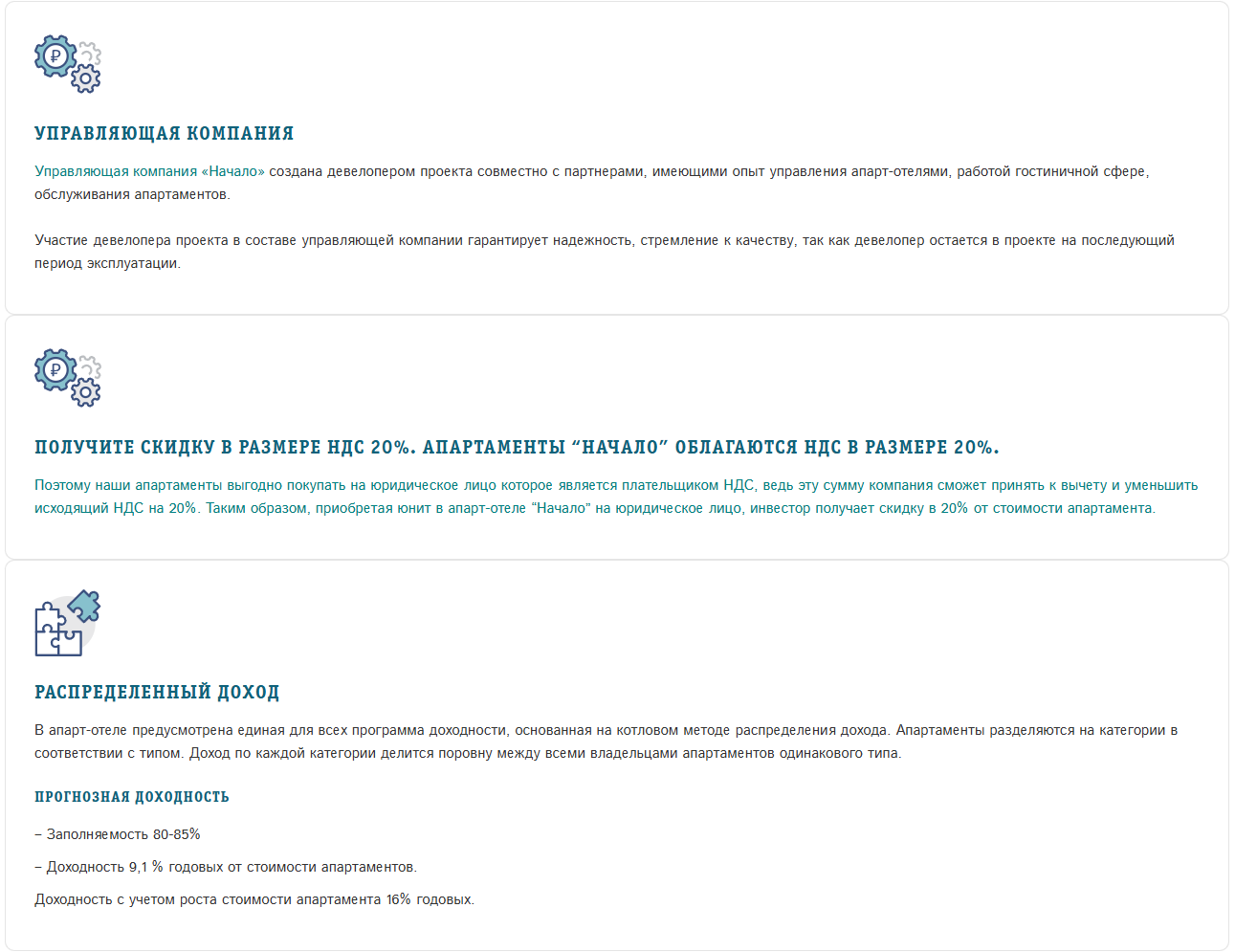 Инвесторам предлагают вложить средства в номера. Прогнозируемая доходность проекта составляет 9,1% годовых от стоимости апартаментов. Если учитывать повышение стоимости помещений, то речь заходит о 16% годовых. Отвечать за обслуживание номеров, заселение гостей и т.д. будет УК «Начало».