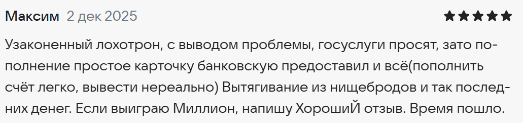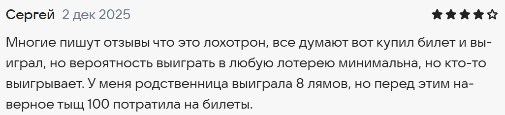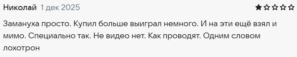 Однако есть и другие отзывы реальных людей о «Национальной лотерее» в 2025 году. Например, пользователь считает приложение мошенническим, поскольку не может в нем выиграть.