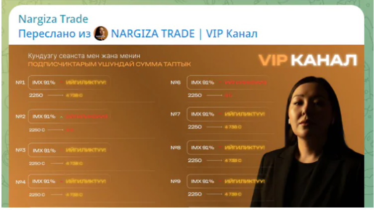 В канале нет полезного контента, в основном Наргиза размещает рекламу торговых сессий, заказные отзывы и скриншоты выплат клиентам. Все это фейк, реальных доказательств торговли нет: отсутствует публичный счет, нет верифицированной отчетности о сделках. В закрытом сообществе трейдер обещает давать прибыльные сигналы, однако на деле просит перевести ей средства на банковские карты третьих лиц, обещая вернуть в несколько раз больше.