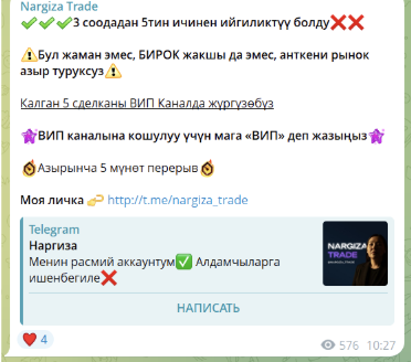 Телеграмм канал Nargiza Trade имеет аудиторию около 5500 человек. Подписчиками являются преимущественно боты, что видно по количеству просмотров, обычно их не более 200-300, комментирование отключено. Автора зовут Наргиза, женщина представляется трейдером и предлагает клиентам стать инвесторами в раскрутке счета. О себе ничего не рассказывает, не предоставляет документов, подтверждающих квалификацию и право оказывать финансовые услуги. Контент публикуется исключительно на киргизском языке.