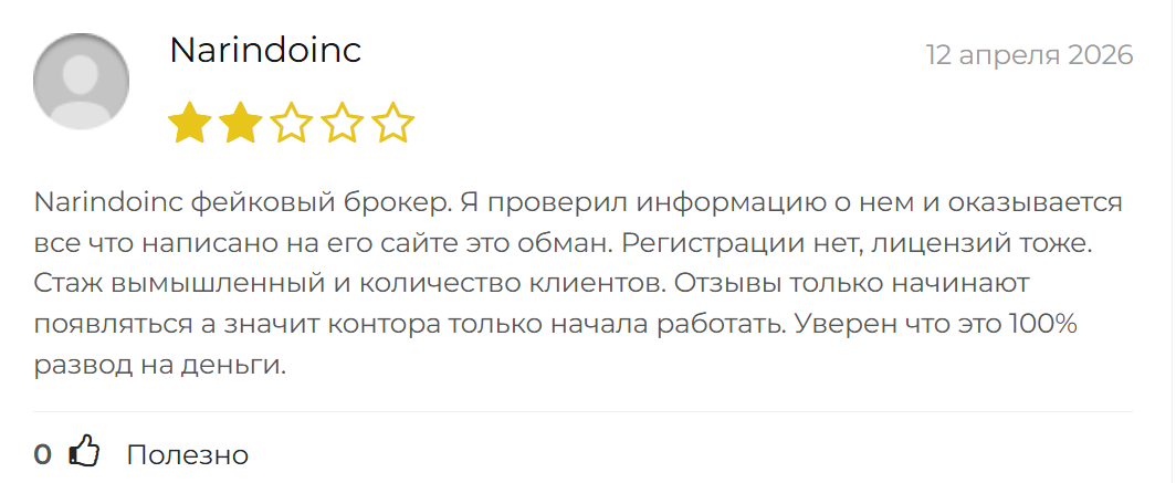Некоторые сразу отмечают, что Narindoinc Com — фейковый брокер, который не достоин доверия. Пользователей смущает отсутствие лицензии, поддельный стаж и неправдивое число клиентов.