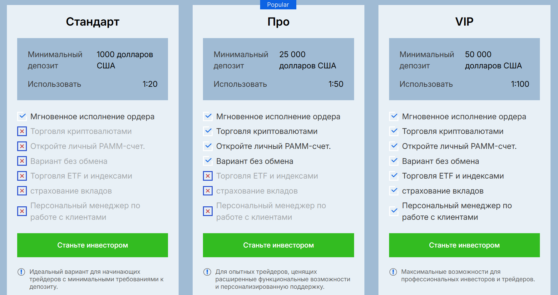 - ПРО. Данный тариф предусматривает минимальный вклад в размере 25 000 USD. В отличие от рассмотренного выше пакета здесь кредитное плечо уже выше — 1 к 50. Клиентам предлагают быстрое исполнение ордеров и торговлю криптой. Есть возможность открытия личного ПАММ-счета и вариант без обмена.