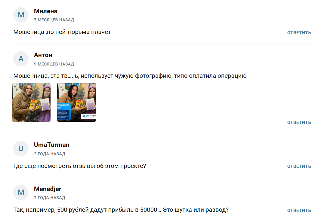 На канале отрицательные отзывы отсутствуют, что вызывает сомнения в их реальном происхождении, поэтому, анализируя все характеристики и жалобы пользователей на развод, можно с уверенностью сказать, что репутация Ульяны крайне негативная.
