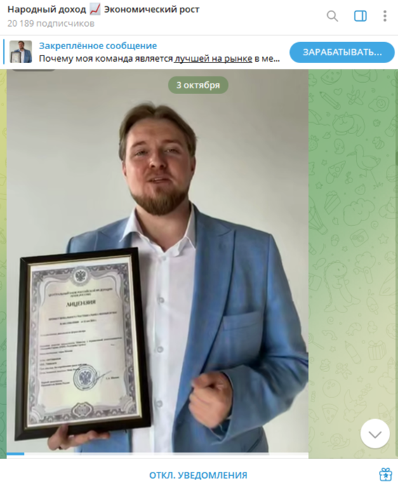 Также автор заявляет об официальной торговой лицензии, выданной Центробанком, но проверить ее существование не представляется возможным, так как конкретных данных Михаил не раскрывает.