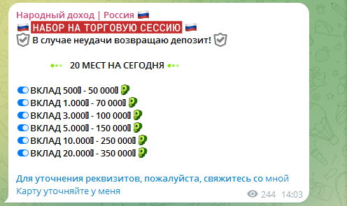 Телеграм-канал «Народный доход Россия» был создан в августе 2025 года. С первого дня автор стал выкладывать условия сотрудничества с его проектом и заманивать к себе в работу.
