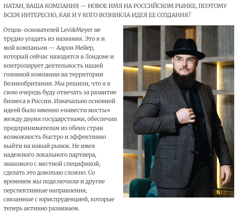 В марте 2020 года на сайтах многих сомнительных журналов Москвы появились статьи, в которых говорилось о Натане Леви. Якобы, существует адвокат, у которого есть фирма в Лондоне, и он приехал покорять Москву. Все статьи объединяла обложка. Вот эта фотография.
