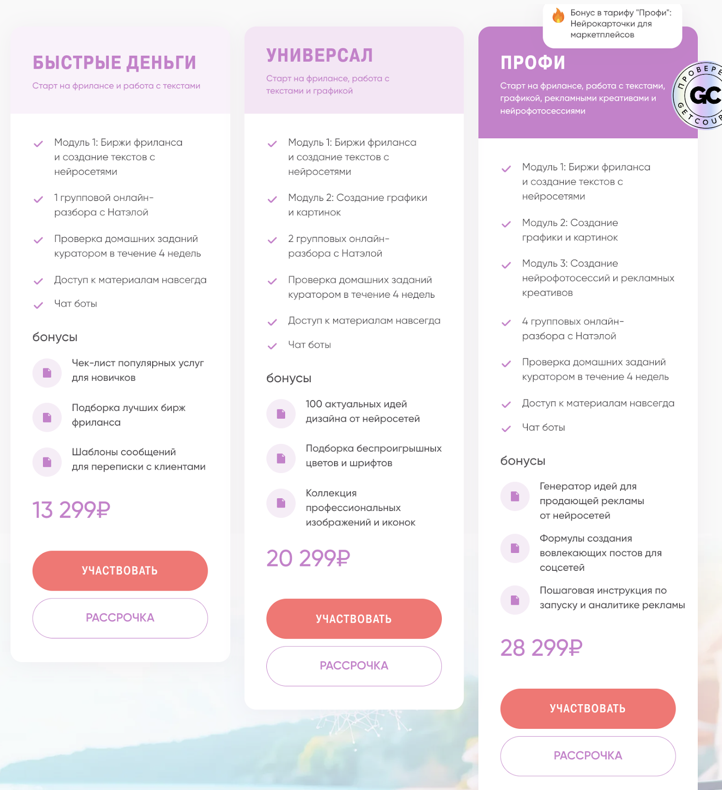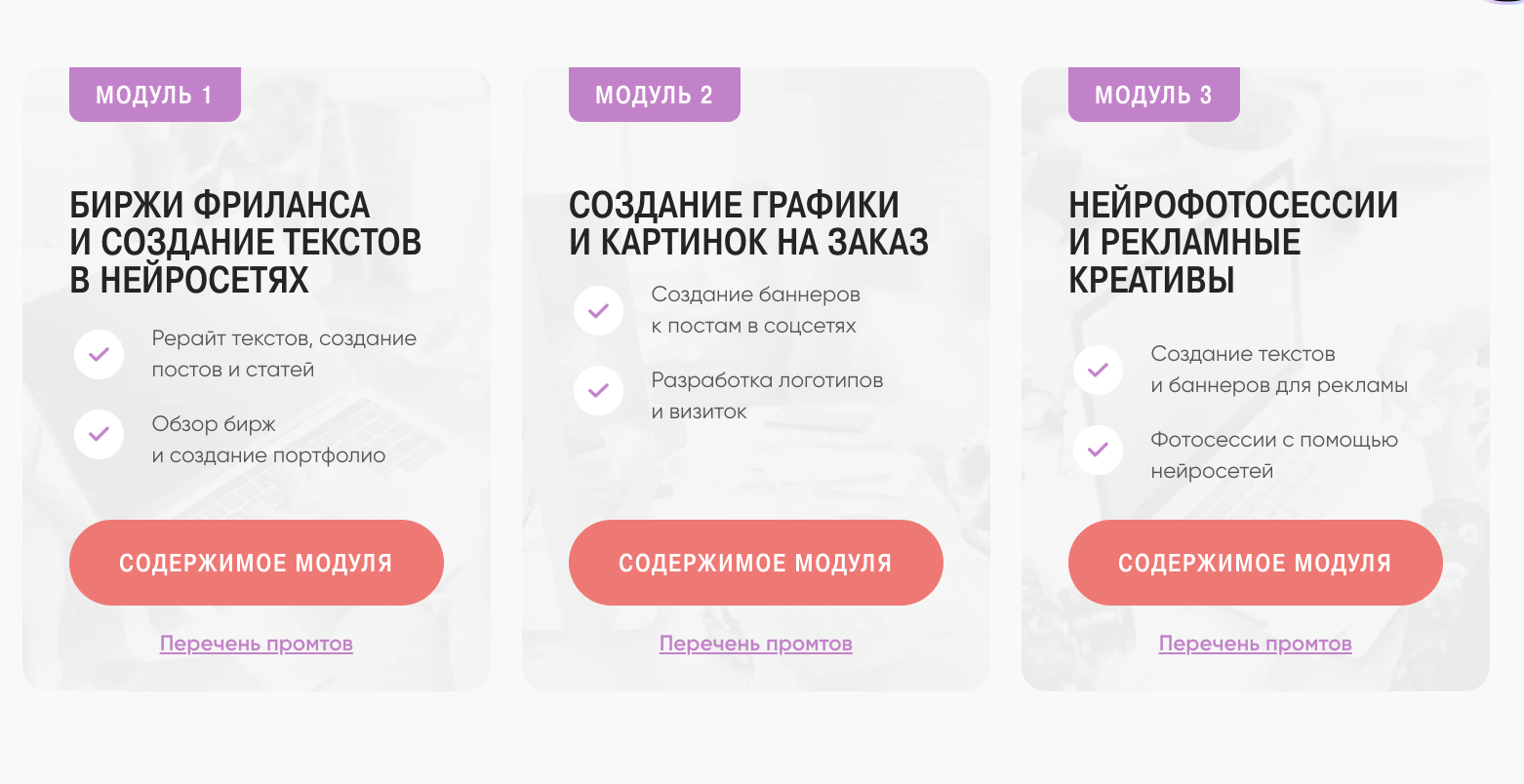 Покупателям дорогих тарифов курса «Нейросети Легкий фриланс» Натэла предлагает другие ее обучающие программы в качестве бонуса. В их число входит «Нейромонтаж видео», «Дождь из клиентов», «Создание карточек для маркетплейсов».