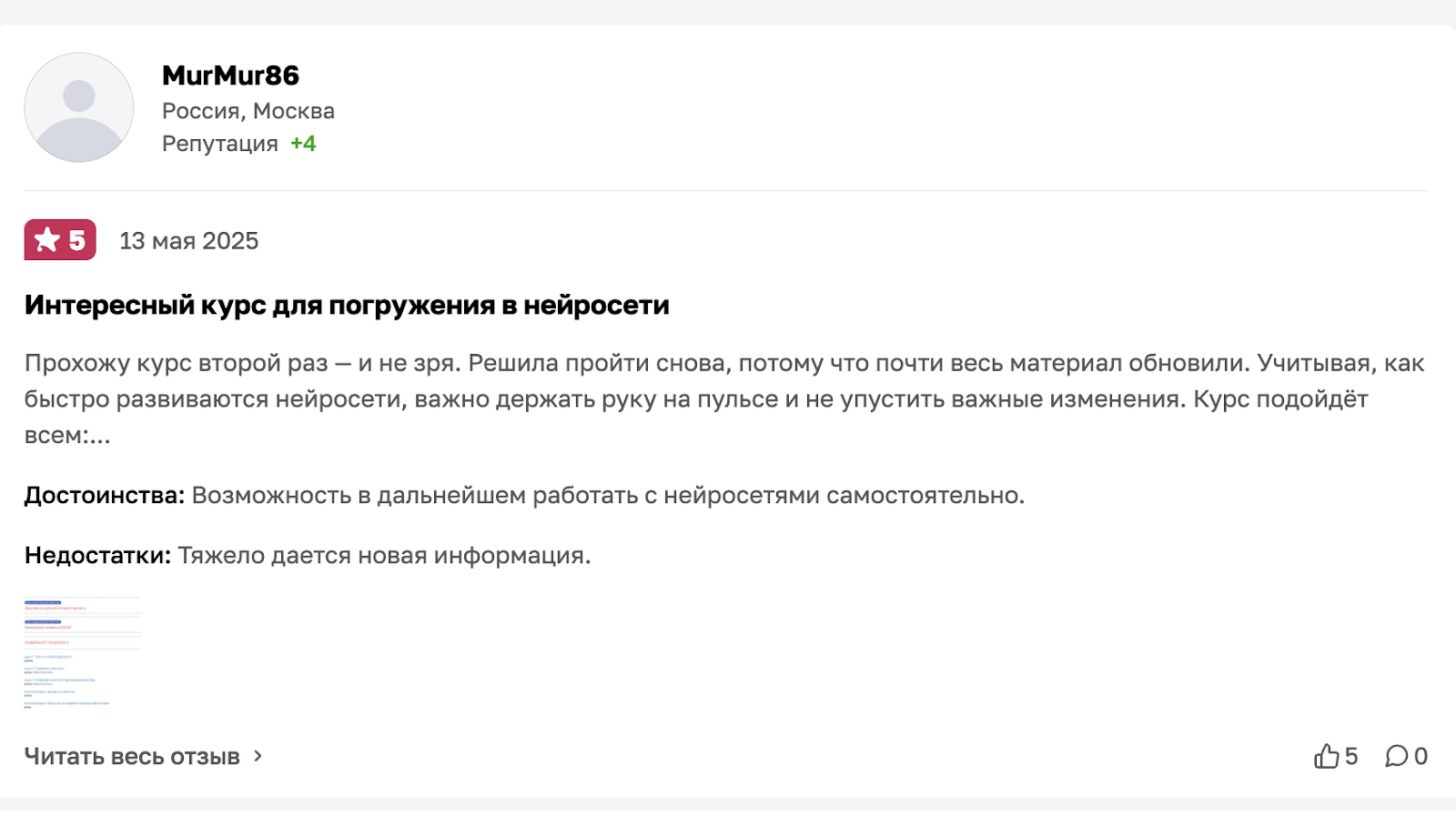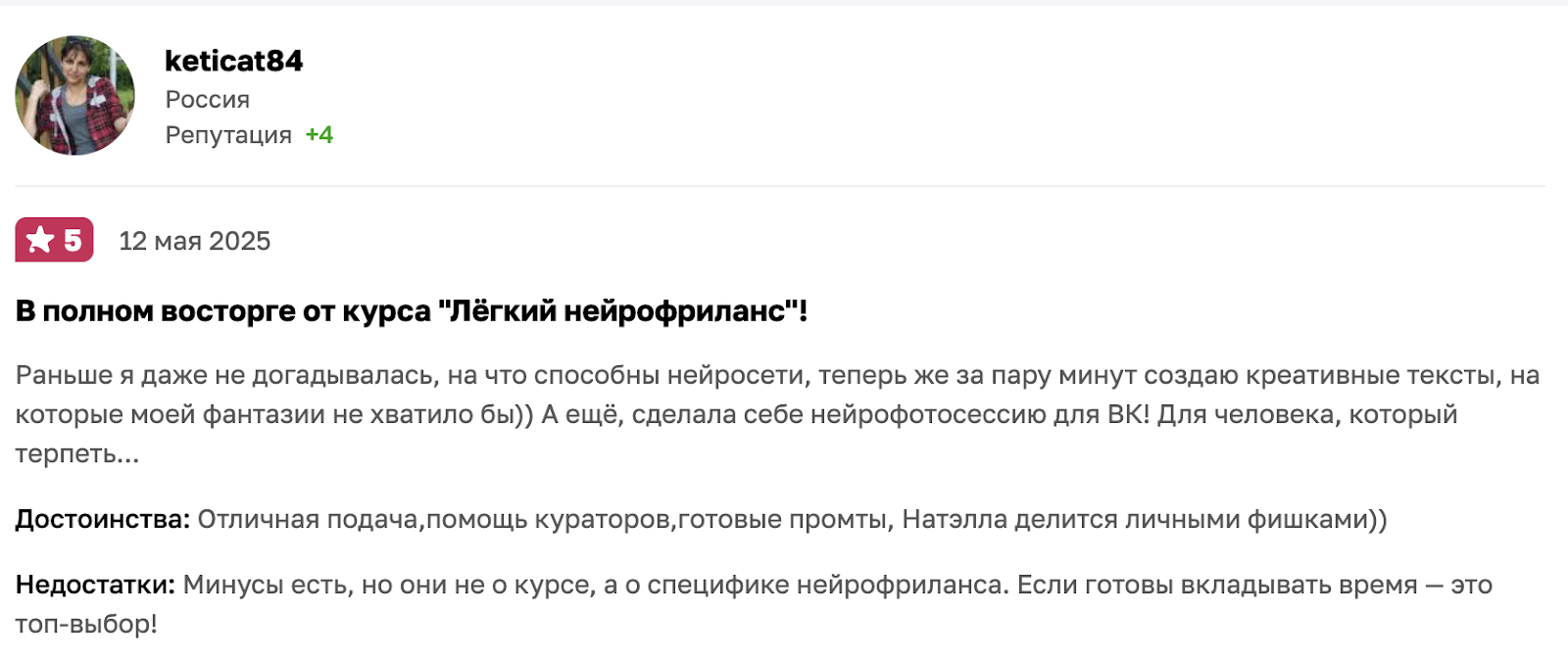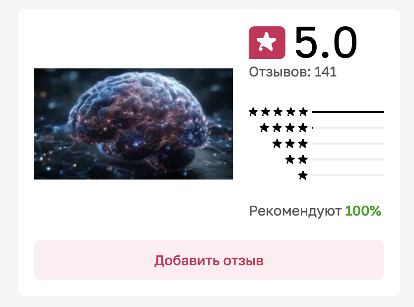 Наставница достаточно известна в информационном пространстве, поэтому найти обратную связь о ней несложно. Отзывы о нейросетях Нателы Зубченко в большом количестве представлены на «Отзовике». Общая оценка проекта на этой платформе составляет 5 баллов из 5 возможных, причем сформирована она на основе 141 комментария.