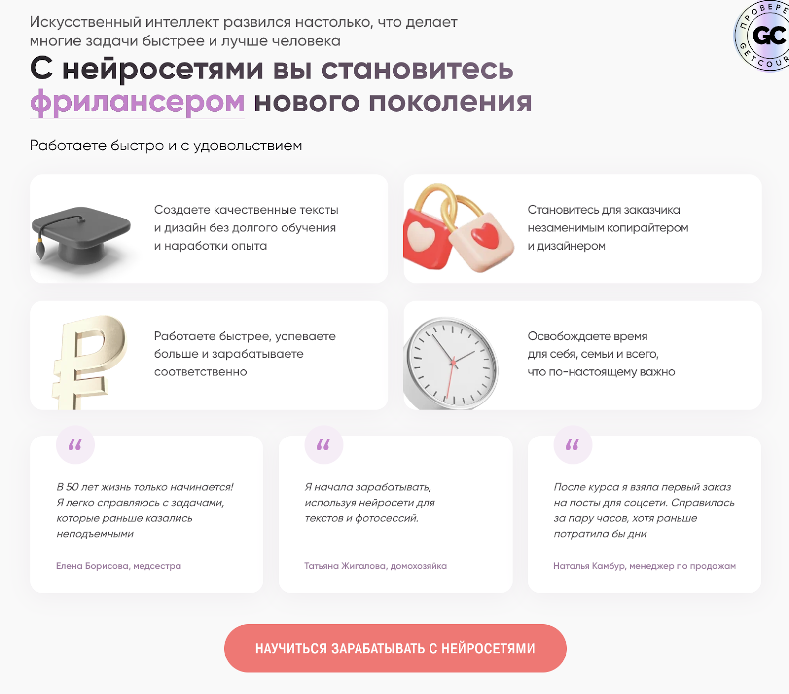 В качестве доказательства качества материала наставница приводит кейс клиентки. Якобы уже через неделю после завершения курса девушка по имени Алена смогла заработать первые 4 тыс. рублей и сейчас пишет вдохновляющие тексты с помощью ИИ. Верифицируемых доказательств этим достижениям на сайте нет.