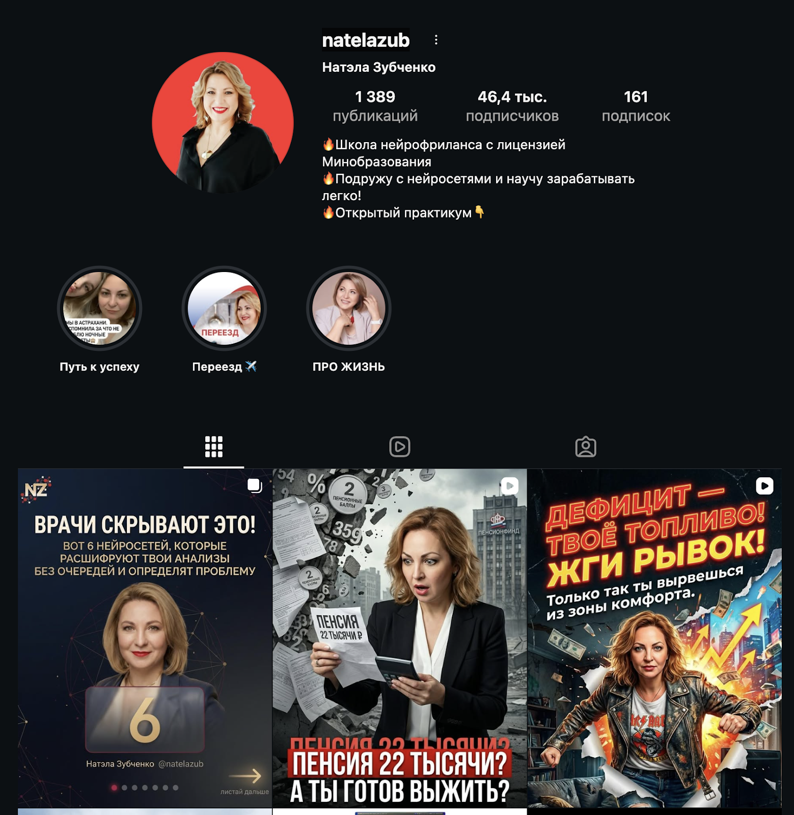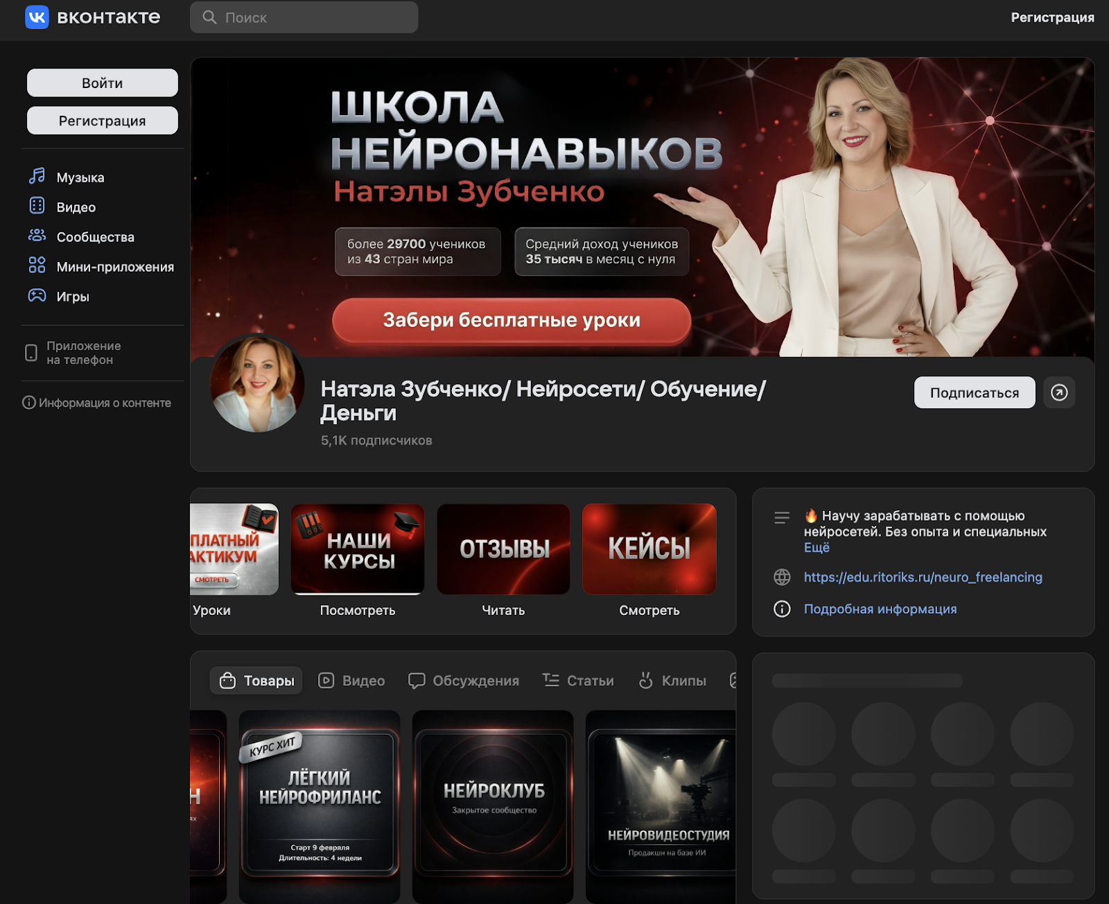 Расположен по адресу Neyronatela и называется «Натэла Зубченко Нейросети Обучение Деньги». На ресурс подписаны 5,1 тыс. человек, он целиком посвящен инфопродуктам коуча. Прямо здесь продают основные обучающие курсы, опубликованы отзывы читателей и кейсы людей, которые закончили школу.