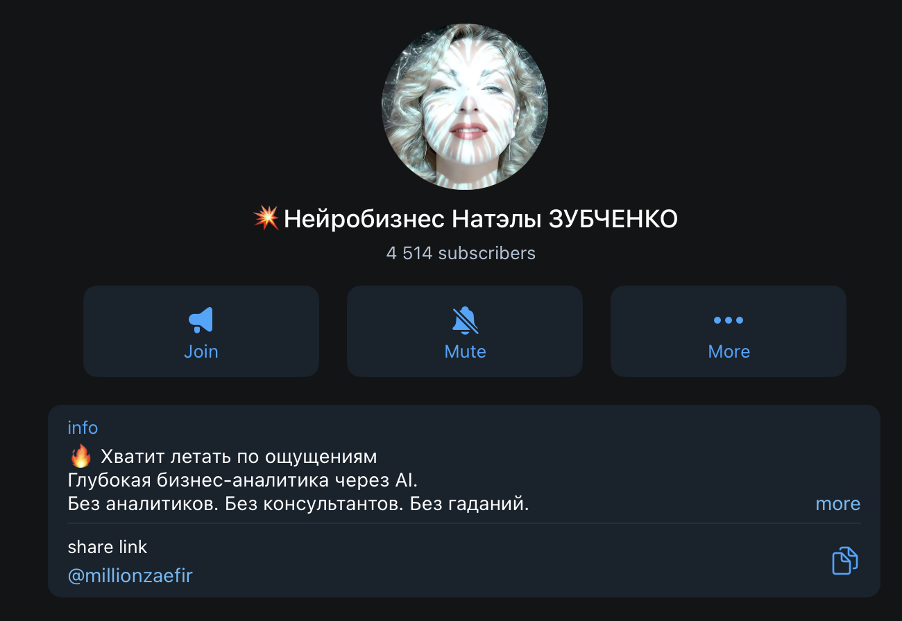 В мессенджере ТГ у наставницы тоже есть отдельный канал «Нейробизнес Натэлы ЗУБЧЕНКО». Если судить по описанию в био, он уже посвящен не генерации контента, а бизнес-аналитике с помощью ИИ. Абсолютно весь контент здесь заточен на рекламу ее обучающих программ. Ничего полезного для себя читатели не найдут.