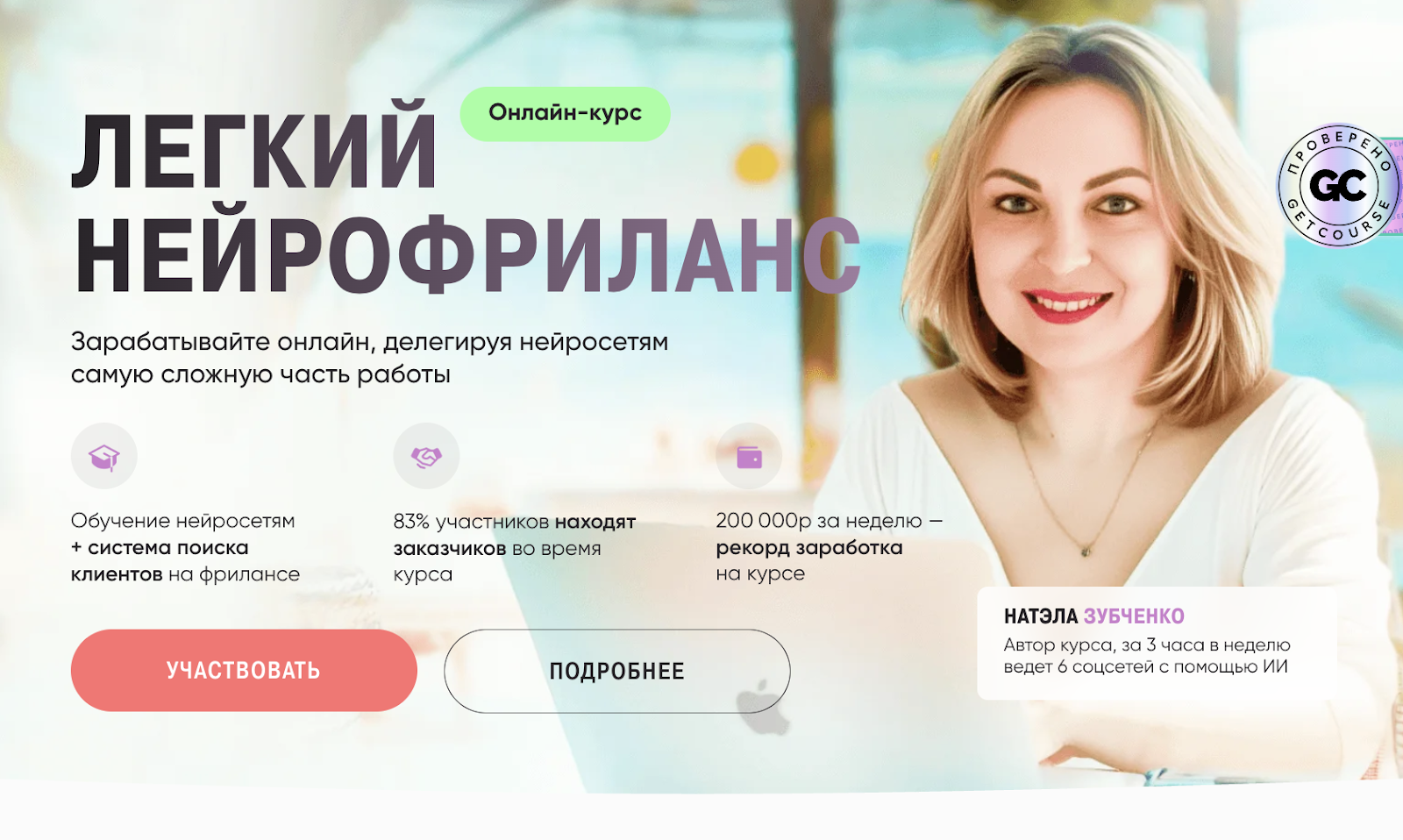 Флагманский курс школы Натэлы Зубченко — «Нейросети Легкий фриланс». Она презентует его на отдельном лендинге и позиционирует как обучение, которое даст ученикам знания для генерации любого контента. Кроме того, преподаватель якобы научит людей поиску клиентов в интернете, что будет приносить до 200 тыс. руб. дохода в месяц. Правда, уже на главной странице она заявляет, что такого результата во время обучения достигает не больше 83% учащихся.