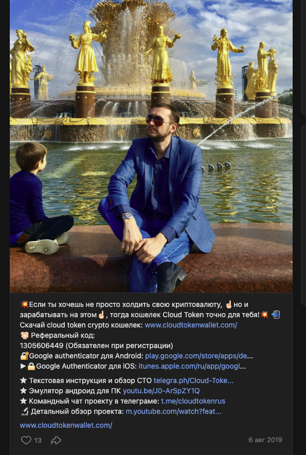 Кроме того, на своей личной странице он продвигал достаточно сомнительные проекты.