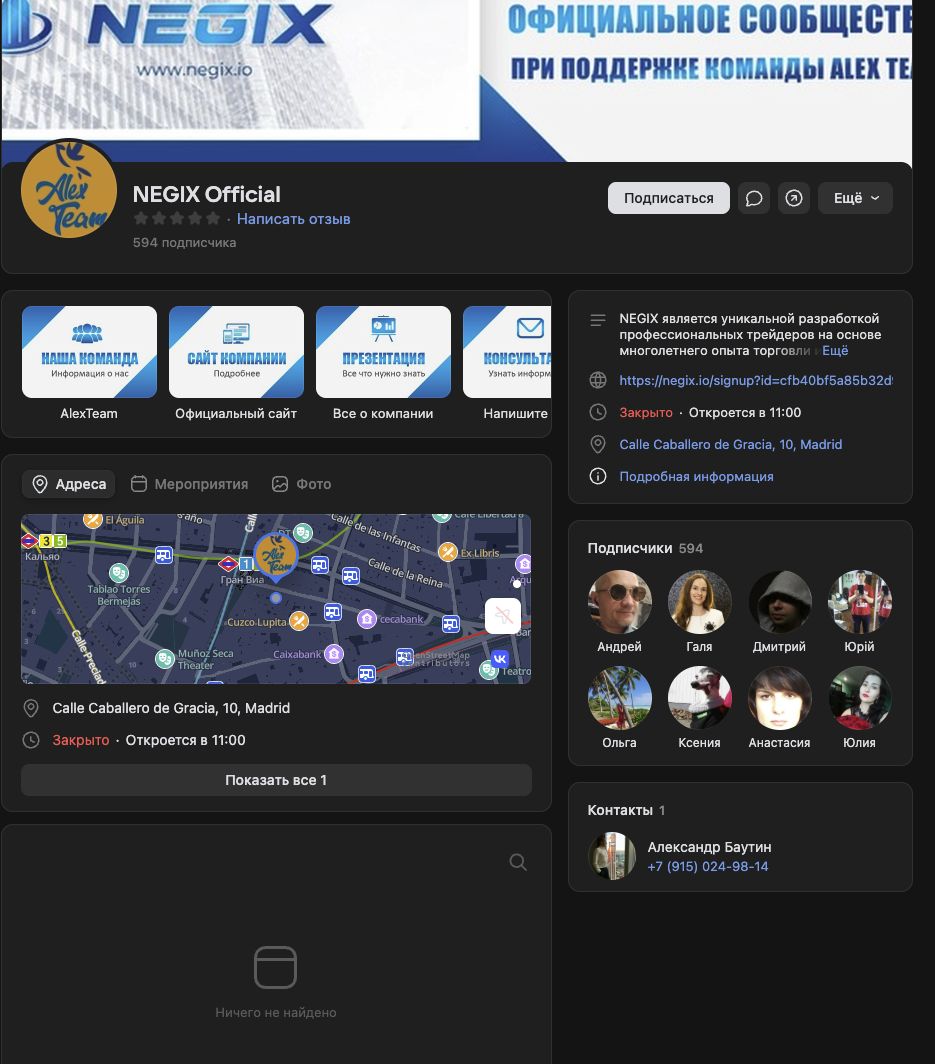 Проект, по всей видимости, запустили в 2016 году. На это указывает единственная оставшаяся социальная сеть компании – группа в ВК NEGIX Official. В ней удалены все записи, но осталась ссылка на некоего Александра Баутина, а также описание работы проекта в шапке профиля.