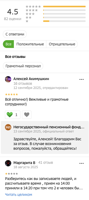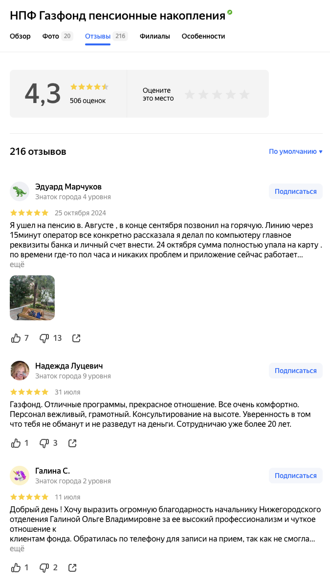 Отзывы людей, настоящих клиентов «АО НПФ Газфонд Пенсионные Накопления» в интернете противоречивые. На популярных площадках по типу «Яндекс Карты» и 2Gis отзывы о gazfond pn ru преимущественно позитивные.