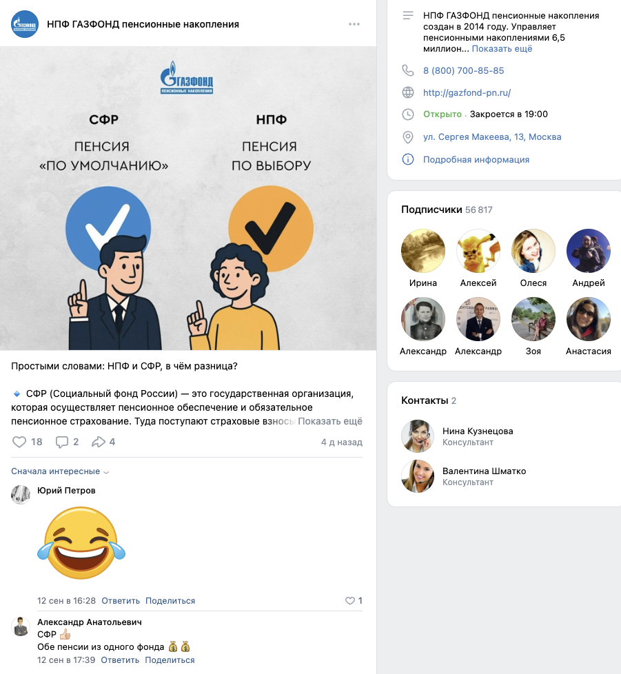 Контент в ленте страницы — это описание услуг пенсионного фонда «Газфонд». Публикации получают по 15-20 лайков и 1-2 комментария. Это демонстрирует, что только сравнительно небольшая часть аудитории продолжает следить за тем, что рассказывают представители организации.