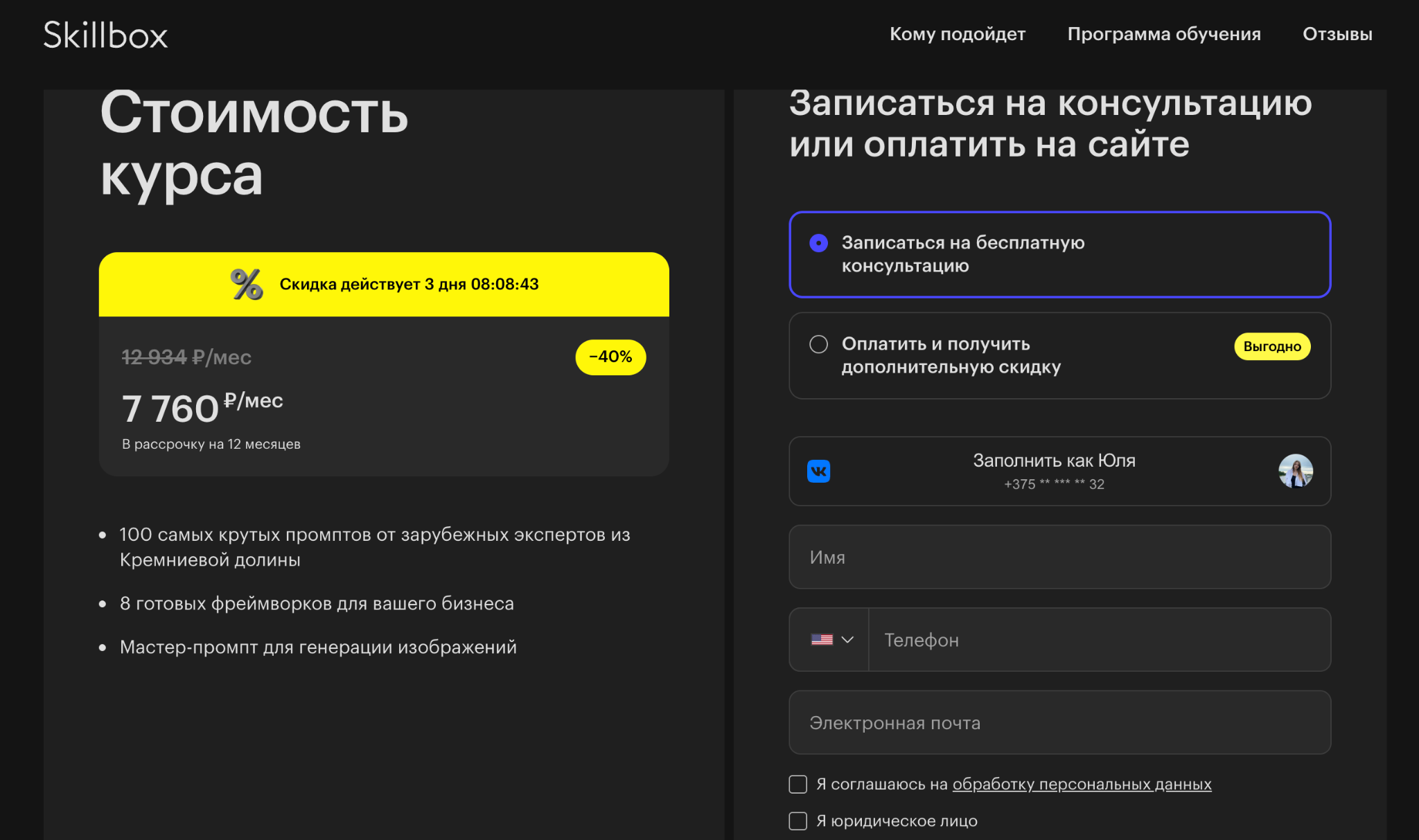 Стоимость указана в формате рассрочки — 7 760 рублей в месяц на год, при этом базовая цена выше. Также заявлена возможность получить налоговый вычет до 13 процентов. Поддержка осуществляется через кураторов, что стандартно для подобных платформ. Дополнительно акцент делается на практике и самостоятельной сборке решений, а не только на просмотре контента.