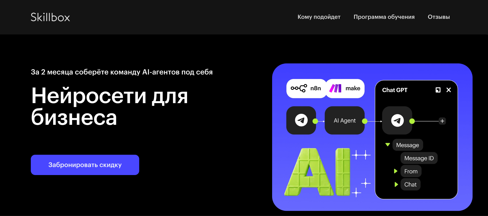 Нейросети Для Бизнеса — курс с упором на создание AI агентов, автоматизацию процессов без кода и внедрение нейросетей в ежедневную работу компании. В рамках обучения участникам предлагают собрать набор инструментов, которые заменяют часть ручных операций и ускоряют обработку данных. Проект позиционируется как практическое решение для ускорение работы, а не как теоретическая база по искусственному интеллекту.