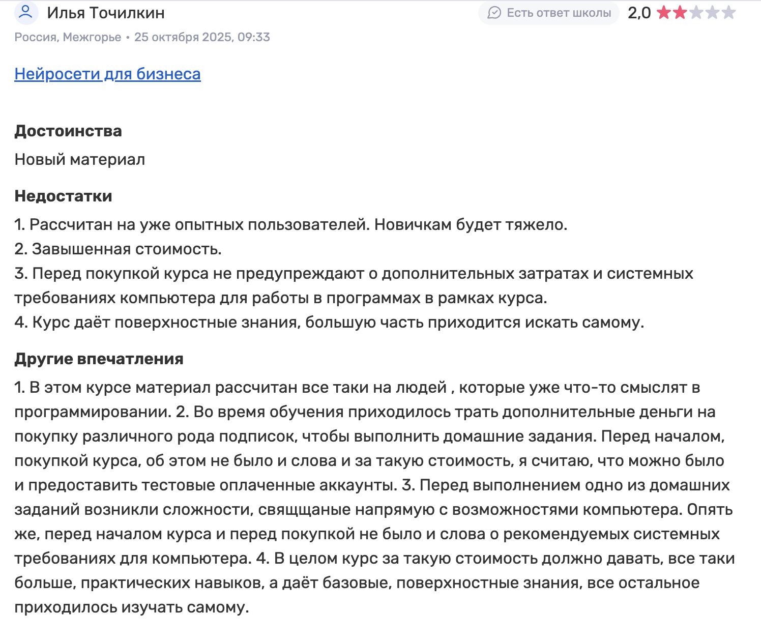 Отзывы о проекте Нейросети Для Бизнеса от Skillbox делятся на два лагеря. В одних комментариях отмечают практическую пользу — особенно блоки по анализу данных и применению ИИ в маркетинге, где реально ускоряется работа с отчетами, идеями и контентом. Также выделяют адекватное объяснение ограничений и этики. В негативных отзывах о Нейросети Для Бизнеса упоминают нехватку практики в отдельных уроках и завышенную стоимость. Дополнительно жалуются на скрытые расходы.
