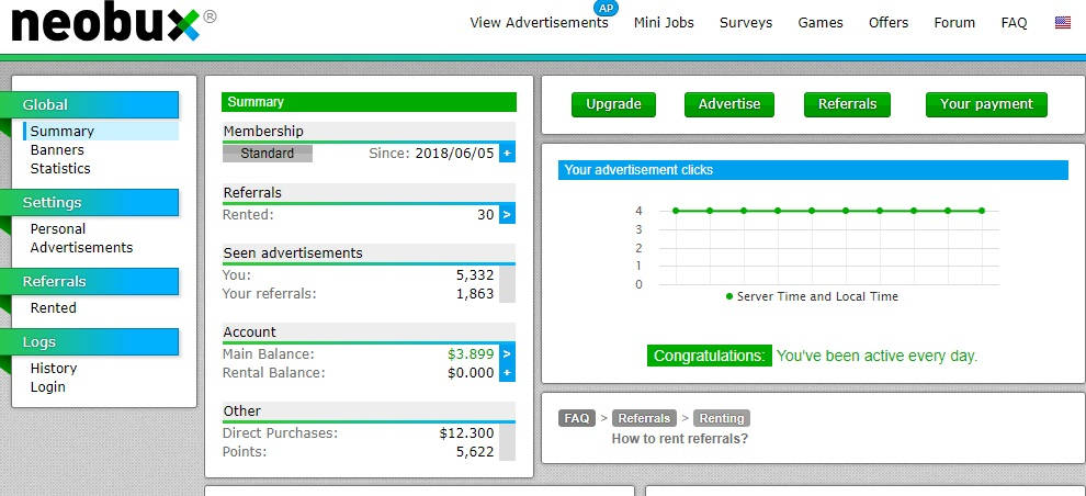 Neobux — рабочий проект, но несколько устаревший. Подходит от для микро-заработка, так как нужны, наверное, тысячи активных рефералов, чтобы зарабатывать здесь хоть немного ощутимую сумму. Для финансового роста платформа не подходит.