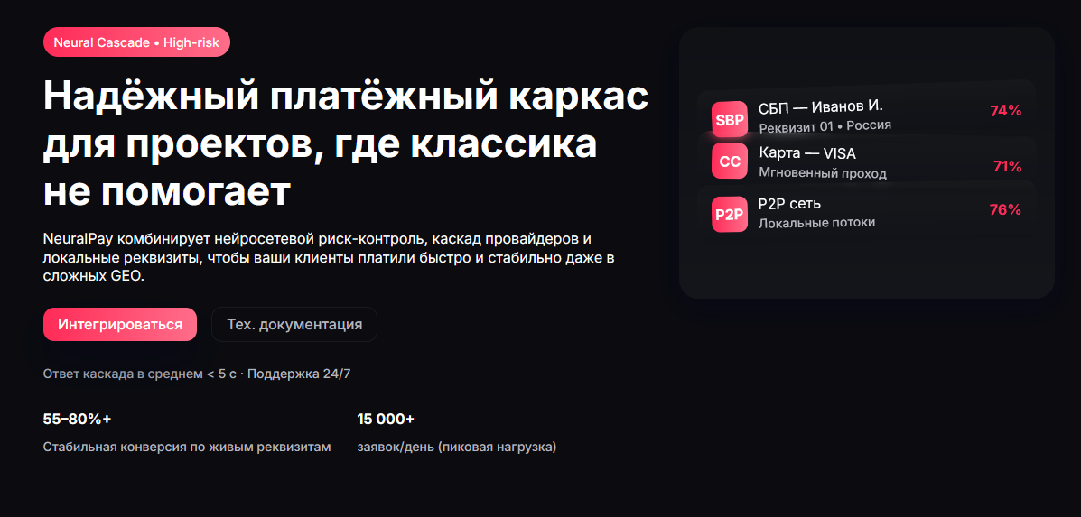 Авторы проекта рассказывают о том, что в основе их платформы лежит ИИ, который отвечает за риск-контроль, каскад провайдеров и использование локальных реквизитов. Совокупность этих факторов позволяет добиться конверсии по реквизитам на уровне 55-80%. Но так заявляют только авторы проекта. Каких-то адекватных доказательств этому нет.