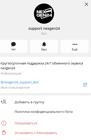 На сайте платформы для обмена криптовалюты Nexgen 24 есть электронный адрес почты основателей Info@Nexgen24 io. На почтовый ящик можно писать как по теме сотрудничества, так и для решения проблем с выводом и вводом финансовых средств. У криптовалютного обменника имеется телеграмм-бот с ником @Nexgen24_Support_Bot.