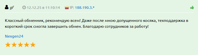 В положительных отзывах клиенты пишут о том, что это классный обменник. Техподдержка завершила процедуру обмена в первый же день при условии, что автор комментария напорол косяков.