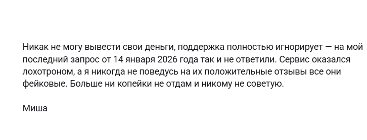 Другой клиент пишет, что так и не смог вывести деньги. Поддержка ничего не ответила и молчит на 14 января 2026 года. В отзыве о Nexgen24 он указывает, что сервис лохотрон и больше никогда не поверит положительных отзывам.
