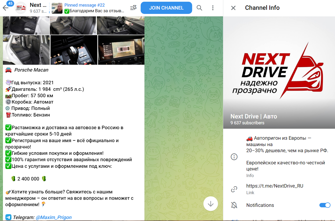 В тгк размещены новые предложения о покупках, детальное описание к авто, а еще для подписчиков размещены преимущества определенных автомобилей. Публикации могут корректироваться, если товар уже приобрели. Кроме этого, в Телеграмм канале Next Drive аудитория может увидеть отзывы от клиентов. Какие-либо новостные публикации отсутствуют, и рекламой чужих проектов админы не занимаются. Часто посты однотипные, и обновляются несколько раз в сутки. Ссылок на остальные страницы в соцсетях основатели проекта не предоставили.