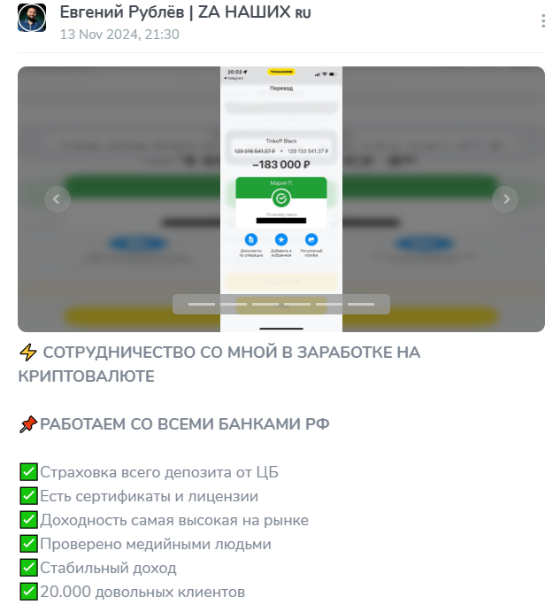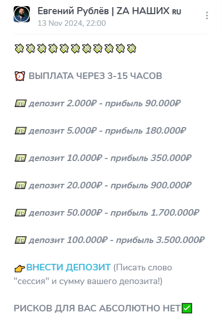 Суммы депозитов отличались в зависимости от канала. На Евгений Рублёв | ZA НАШИХ 🇷🇺 минимально можно было вложить 2000 рублей, на которые за день обещали заработать 90 000 прибыли. Клиентам раздавали гарантии отсутствия рисков, заявляли о страховке депозитов в Банке России, что является очевидным враньем.