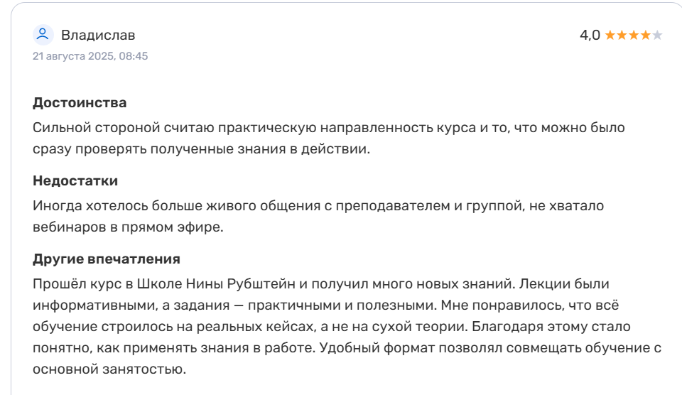 Но у школы есть важный риск, о котором говорит сама система работы: качество программы зависит от одного человека, а квалификация Нины подтверждена только ее словами. Курс формируется не академической психологией, а личной методикой автора.