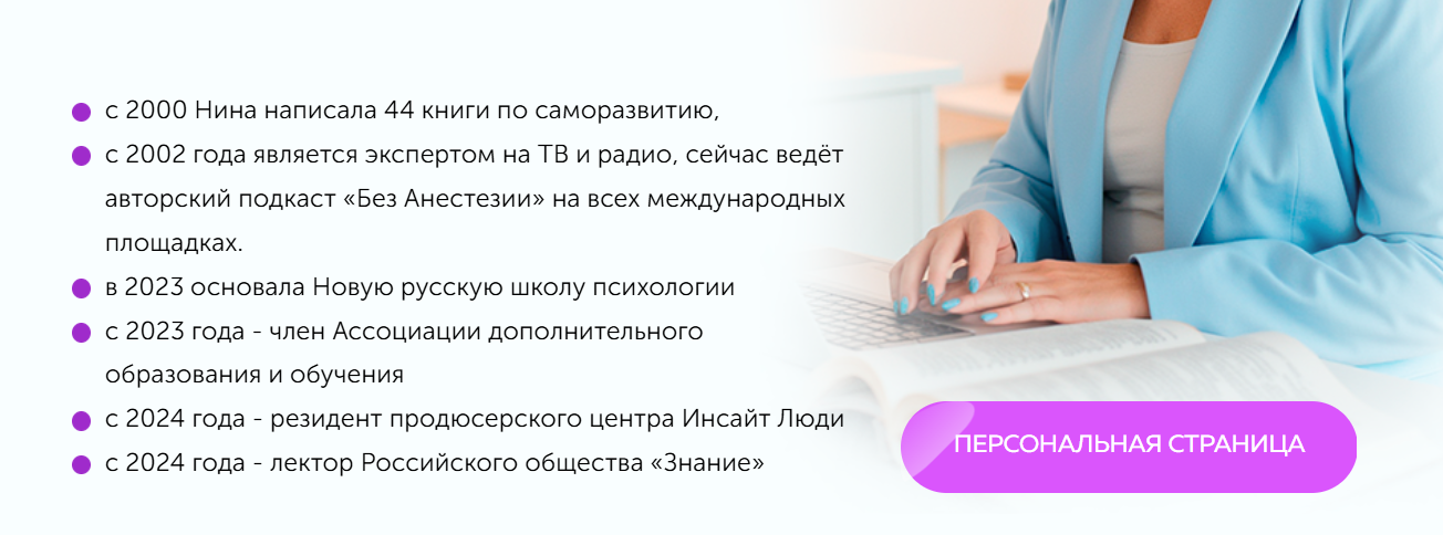 Нина позиционирует себя как социопсихолог, автор 44 книг, спикер и основатель Новой Русской Школы Психологии.