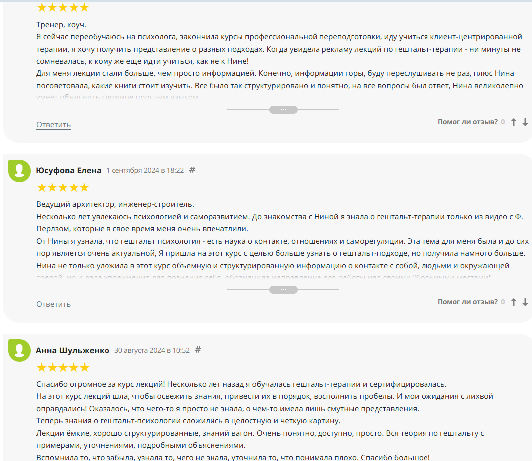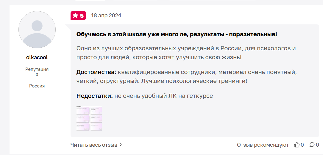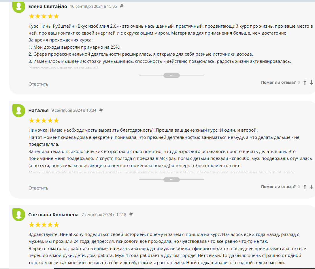 Люди подробно описывают, какой курс проходили, какие изменения заметили в отношениях, самооценке, деньгах, профессии.