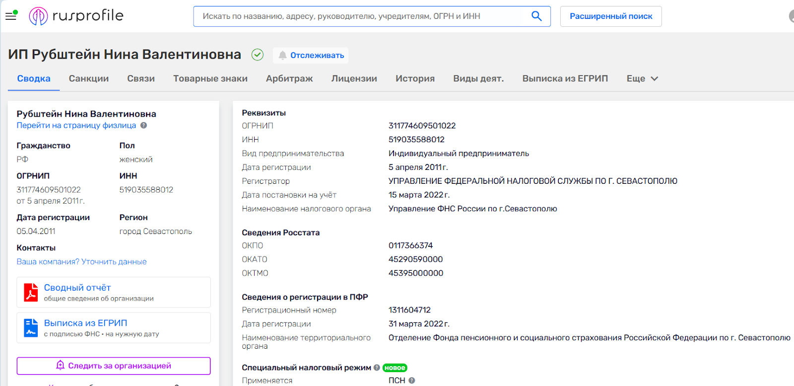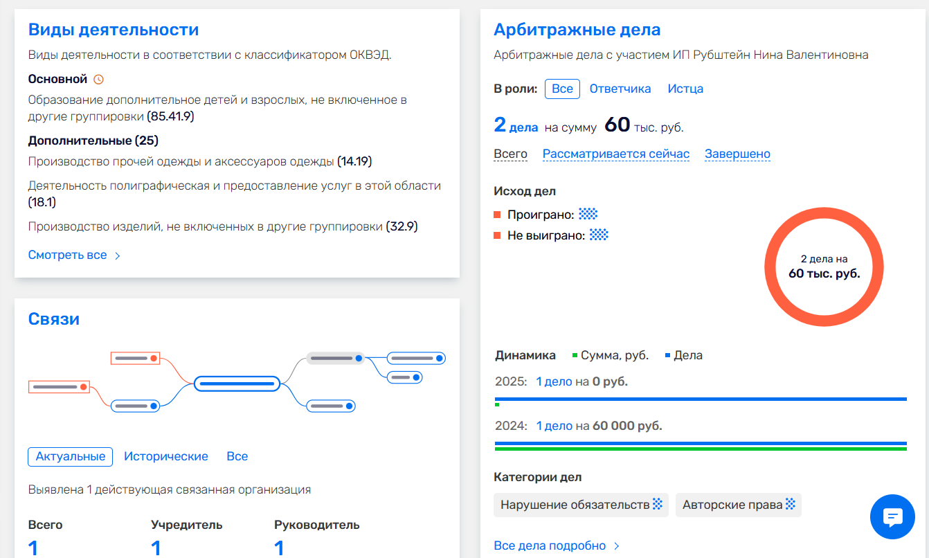В реестре видны и дополнительные ОКВЭД: консультирование, маркетинговая и рекламная деятельность, обработка данных и размещение информации в сети. Это объясняет почему, набирая “Нина Рубштейн телеграм”, открывается разветвленная воронка из соцсетей, рекламных объявлений и веб-страниц.