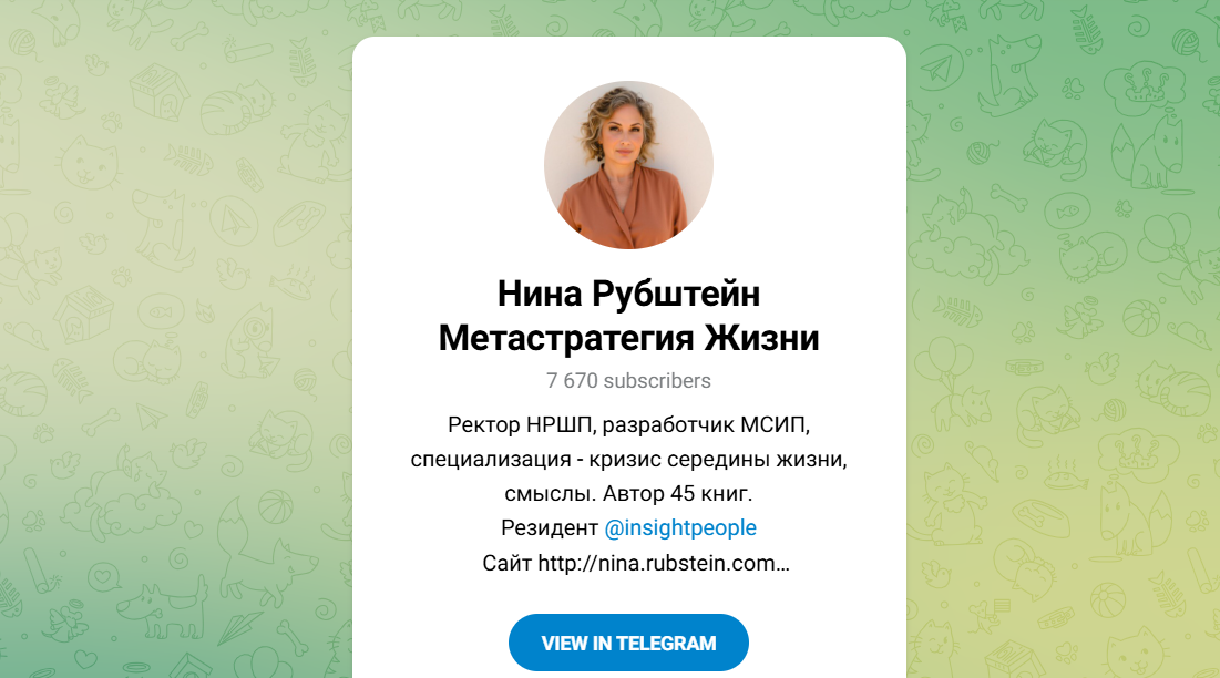 Есть ТГ канал с 7К+ подписчиками и Rutube “Нина Рубштейн психология простым языком”, которые показывают как Нина работает в формате видео и интервью.