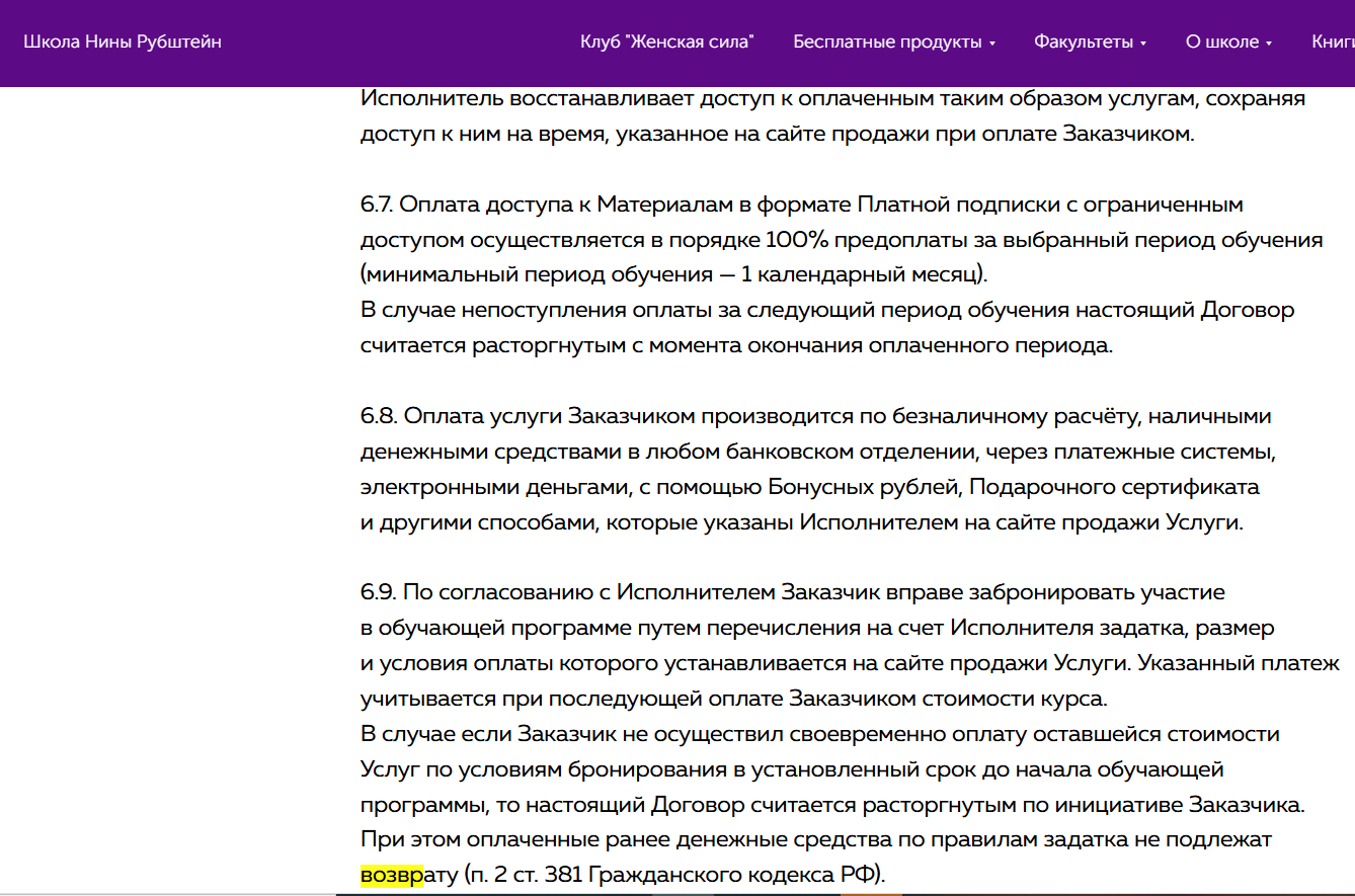 В оферте школы самый проблемный момент — почти полное снятие ответственности с автора. Курс считается оказанным сразу после выдачи доступа, а возврат денег невозможен. Школа может менять программу без предупреждения и ограничивать доступ.