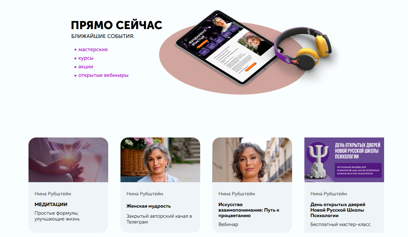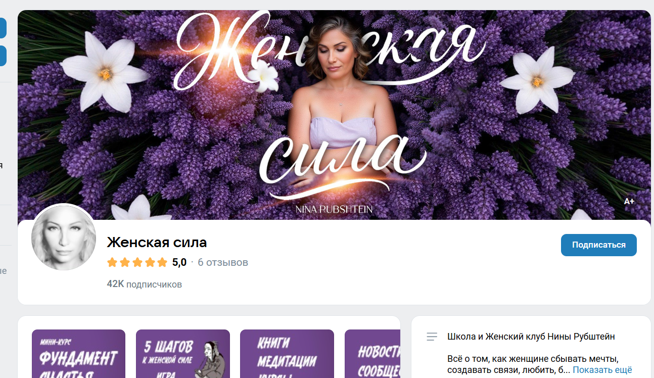 Есть активный бренд “Нина Рубштейн Женская сила” ВК, который воспринимается как женский клуб Нины и насчитывает 42К подписчиков. Там много постов про женскую психологию, самоценность, семью плюс приглашения на вебинары и курсы.