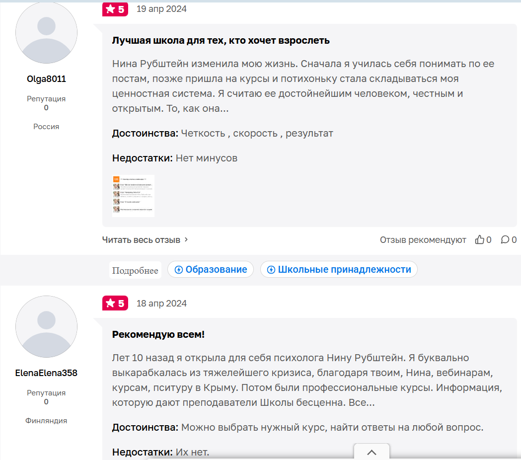 Кроме того, Школа Нины Рубштейн и ее денежные программы (Вкус изобилия, Деньги внутри, Деньги для взрослых и пр.) направлены на работу с внутренними убеждениями. Это психологические и мотивационные курсы, а не финансовое образование: в них нет аналитики, инвестиций или экономических инструментов, они работают через изменение внутренних установок, а не через финансовые навыки.
