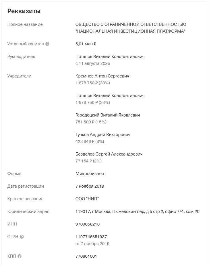 ООО НИП зарегистрировано в ноябре 2019 года. Компания имеет уставный капитал 5,01 миллиона рублей:
