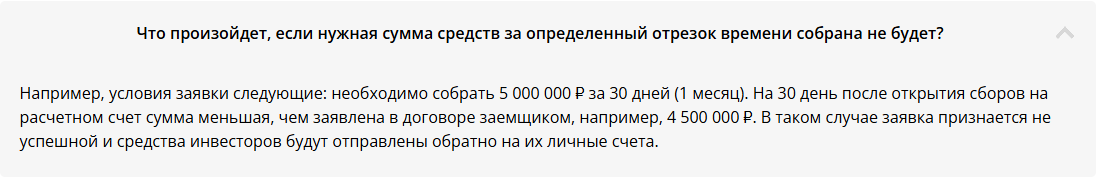 Компаниям и ИП предлагают получать от 100 тысяч до 10 миллионов рублей. При этом финансирование проходит в формате краудфандинга. Если в заявке указана определенная сумма, но она не была собрана за 1 месяц, то компания вообще ничего не получает: