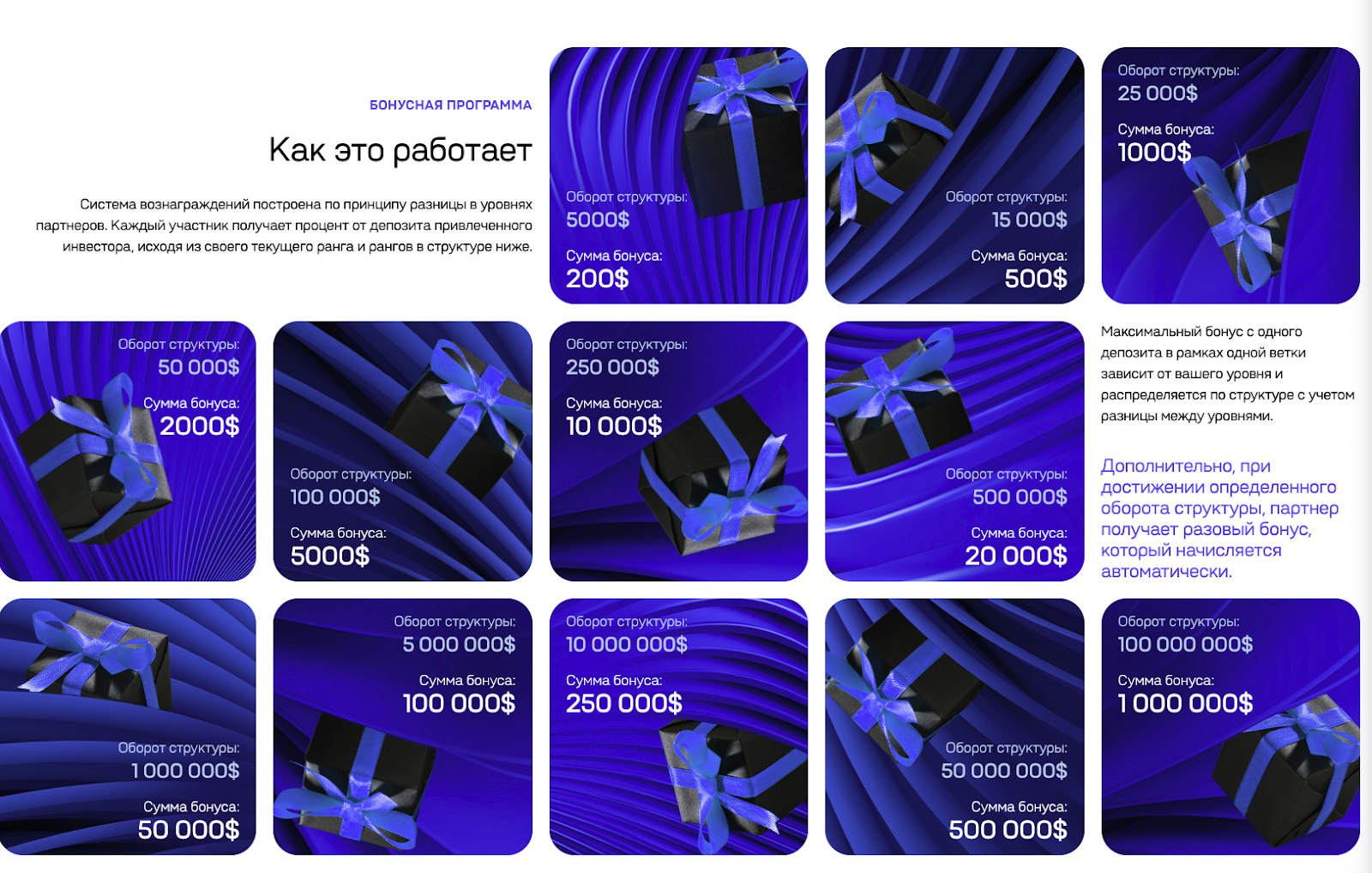 Бонусная программа включает 10 уровней. Для максимального уровня нужно достичь оборота структуры в целых 100 миллионов долларов. В этом случае создатели проекта обещают партнеру миллион долларов в качестве бонуса.