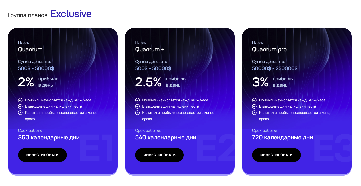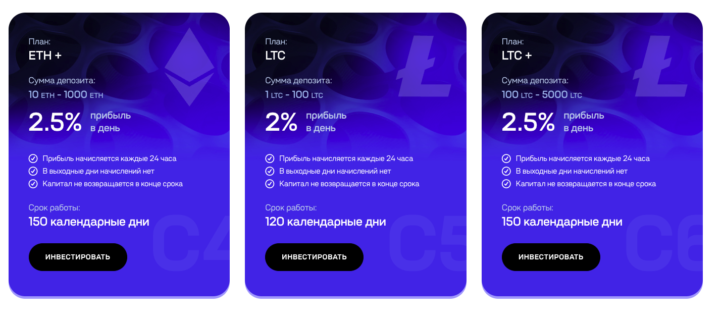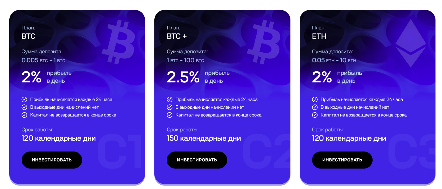 Авторы рассказывают о том, что зарабатывают на инвестициях, трейдинге, майнинге. Для пользователей доступно большое количество тарифных планов, которые отличаются минимальными суммами депозитов и доходностью. Начать инвестировать предлагают всего с 50 долларов. Доходность начинается от 0,4% в день и может достигать 3%.