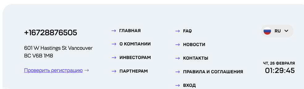 На сайте указаны сведения о регистрации компании в Канаде, даже дана ссылка на проверку регистрации.