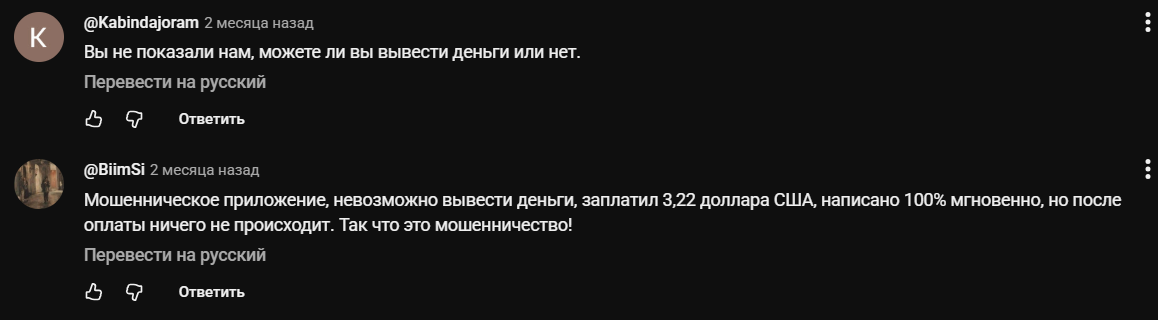 В Интернете пока нет много отзывов о боте Not Mining App, а продвигается он через ютуб-каналы и под одним из роликов можно заметить несколько комментариев. Они написаны в негативном ключе и включают, по сути, жалобы на то, что приложение мошенническое. Главное нарекание в том, что вывод NOT здесь не предусмотрен, а весь сервис работает в качестве обычной игры, а не ресурса для добычи криптовалюты.