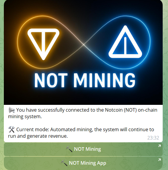 Далее бот выводит сообщение о том, что пользователь успешно подключен к добыче крипты, а текущий режим установлен как автоматический. Это означает, что система «Нот Майнинг Апп» якобы будет работать полностью автономно и генерировать доход без участия владельца аккаунта.