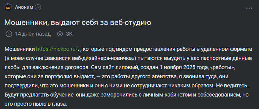 Novakorp – очередной псевдопроект, маскирующийся под веб-студию. Сайт создан недавно, а уже активно заманивает людей «вакансиями», требуя открыть ИП и расчётный счёт, вероятно, ради партнёрских бонусов. Отзывы пользователей подтверждают: после «обучения» и «стажировки» задания не оплачиваются, а связь с «работодателем» обрывается. Классическая схема обмана доверчивых соискателей.