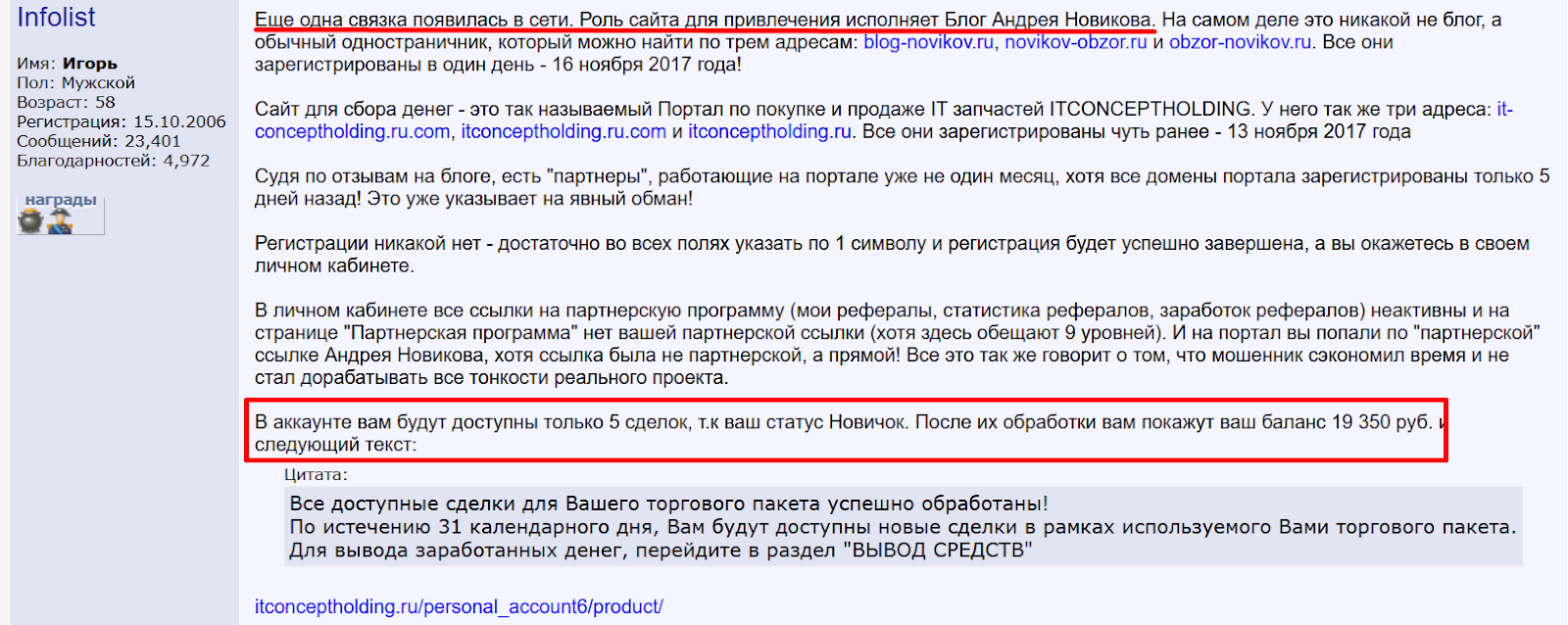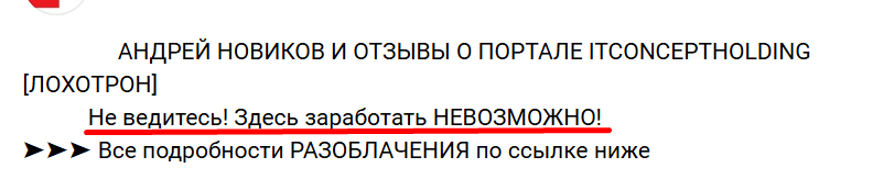 Про инвестиции с Новиковым Андреем Витальевичем отзывы негативные, а сам автор проекта уже свернул площадку Itconceptholding ru com. Однако схема его обмана регулярно появляется в интернете под различными маркировками. Далее в статье выясним детали финансовой ловушки и рассмотрим какие отклики оставляют пользователи о данном персонаже.